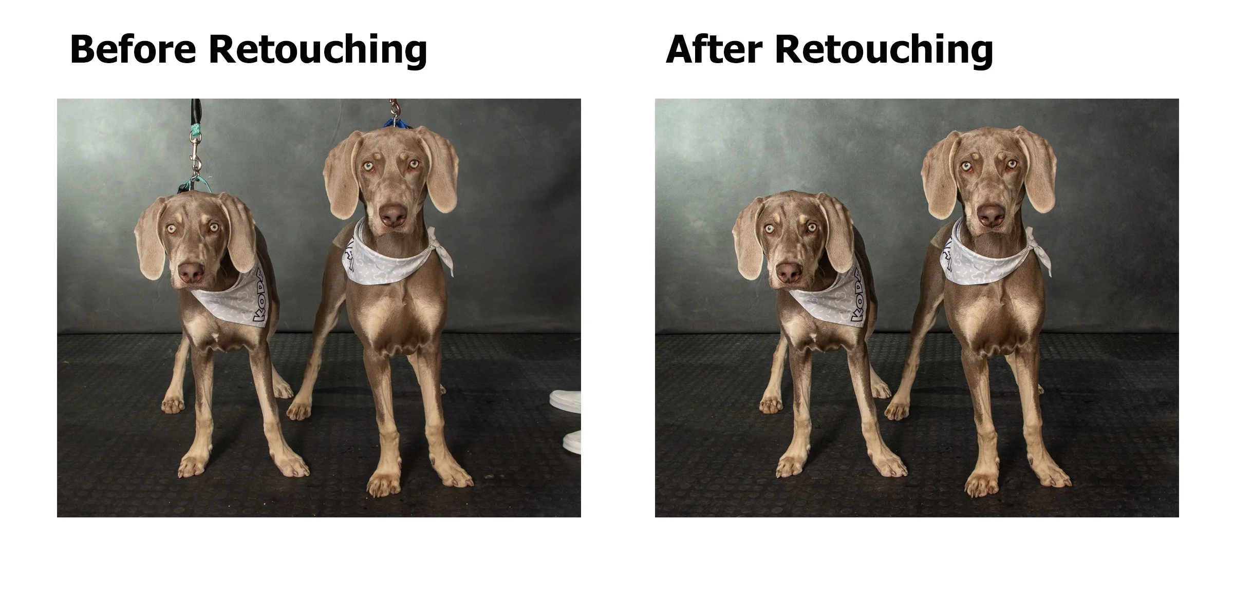 Koda and Jasper, Weimaraner puppies less than a year old, would only pose together if they were being held by their owner on leash. Before retouching you can see the leashes pulling up on the collars and the owner’s shoes. In the final shot those distracting elements are removed.