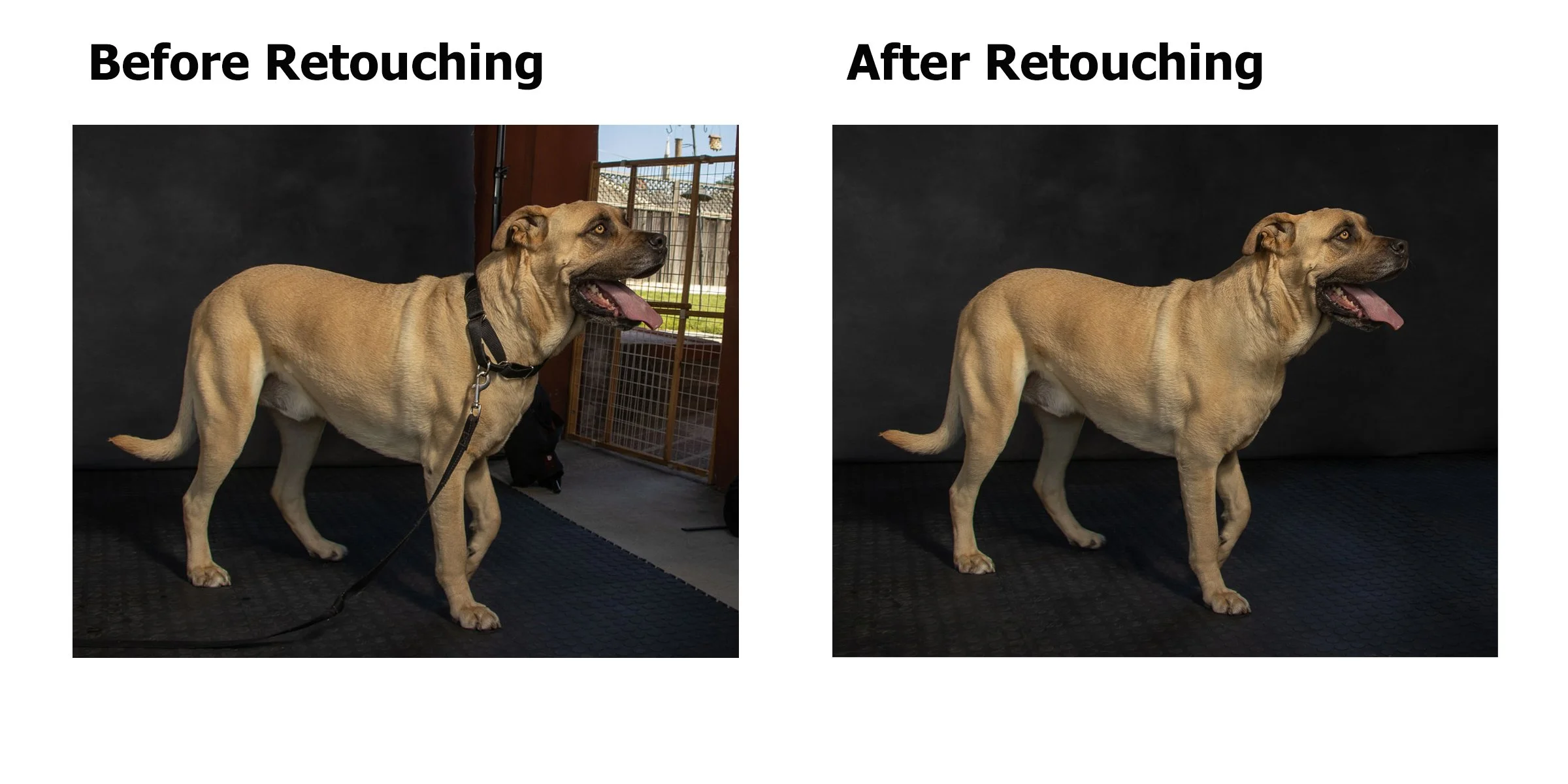 Peanut, named ironically because he’s so big, was anxious about being photographed. We kept him on leash since his tendency was to wander off. On the left is a good photo of him, but the backdrop is not long enough and the leash and collar are very visible. Luckily the floor and background can be extended and his leash and collar removed.