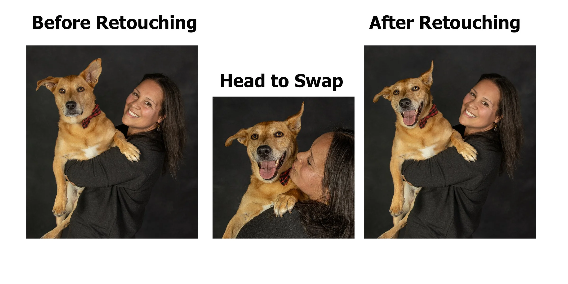 Before retouching the goofy dog Wilson has a serious expression while his owner is smiling. Luckily we have another shot from a similar angle where Wilson has a more “smiley” face. Voila, in the final image the dog’s face from the second image is “swapped” in so that both person and dog are looking happy together.